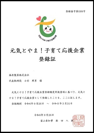 We are pleased to announce that we have been registered as a "Genki Toyama! Childcare Support Company."